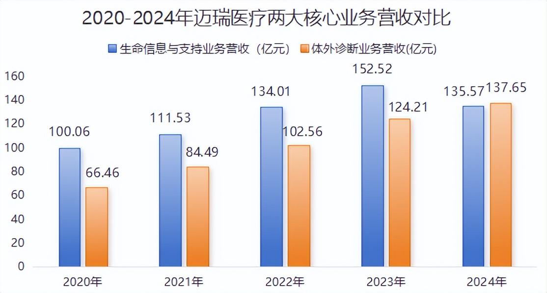 2024年,迈瑞医疗的体外诊断业务实现营收137.65亿元,同比增长10.82%,收入规模首次超过生命信息与支持(135.57亿元),成为公司的第一大业务。