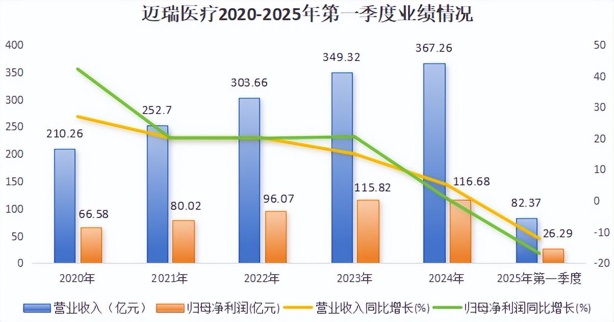 2025年第一季度,迈瑞医疗业绩依然没有回升的迹象,公司营收达到82.37亿元,同比下滑12.12%,净利润为26.29亿元,同比下降16.81%。