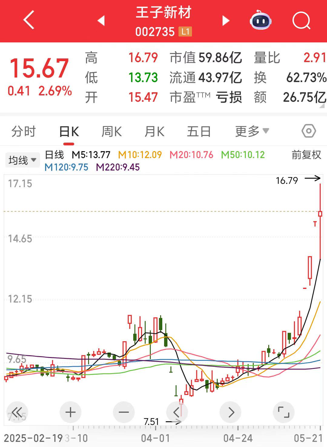 值得注意的是,王子新材股价较近日低点已经实现翻倍。4月9日,该股盘中最低报7.51元/股,5月12日开启加速上涨,至5月20日实现7天4板。截至今日收盘,王子新材上涨2.69%,报15.67元/股。