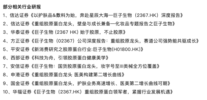 南都湾财社记者注意到,华熙生物点名的一众券商研究报告中,对应研报内容的主角皆是巨子生物。具体包括:华泰证券发布的《巨子生物:始于胶原,不止胶原》、安信证券发布的《巨子生物:国货胶原蛋白龙头,妆字号至III类械全方位覆盖》、信达证券《以护肤品&敷料为始,奔赴星辰大海——巨子生物深度报告》等。