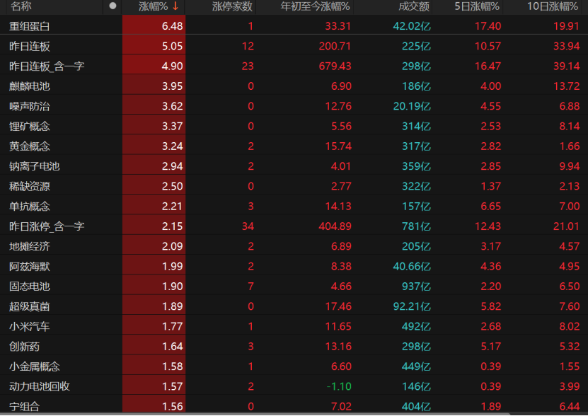 重组蛋白继续走高,今日涨幅超过6%,近10个交易日内累计涨幅约为20%。今日麒麟电池、锂矿概念,以及黄金概念也均有不错的表现。