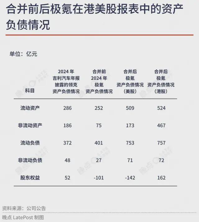 2025 年 3 月 20 日,吉利汽车和极氪均发布了按照美国会计准则下的未经审核备考简明合并财务资料,其中公示的合并后备考财务数据显示,2024 年底极氪的资产/负债为 692 亿元 /834 亿元,其净资产为-142 亿元,相较合并前的-101 亿元扩大了-41 亿元。