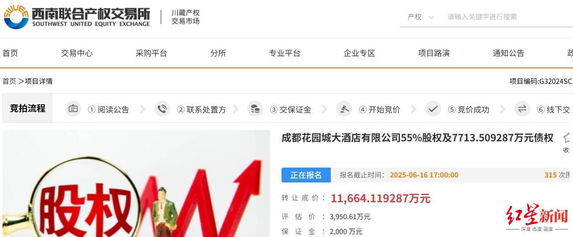 西南联合产权交易所网站显示,成都花园城大酒店有限公司55%股权及7713.51万元债权转让底价为1.17亿元,竞买报名截止时间为6月16日。截至发稿,挂牌已吸引了315次围观。