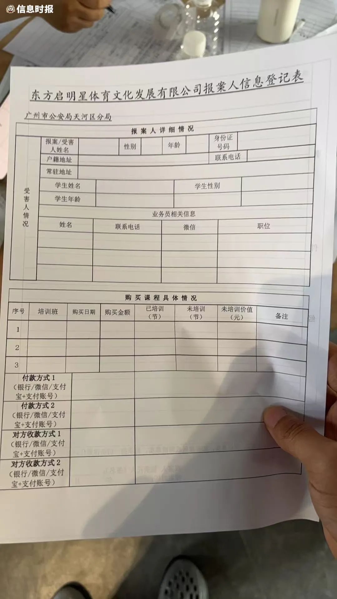 记者在现场看到,在园区附近,有十余名家长填写《东方启明星体育文化发展有限公司报案人信息登记表》,填写完毕后交给属地派出所民警。