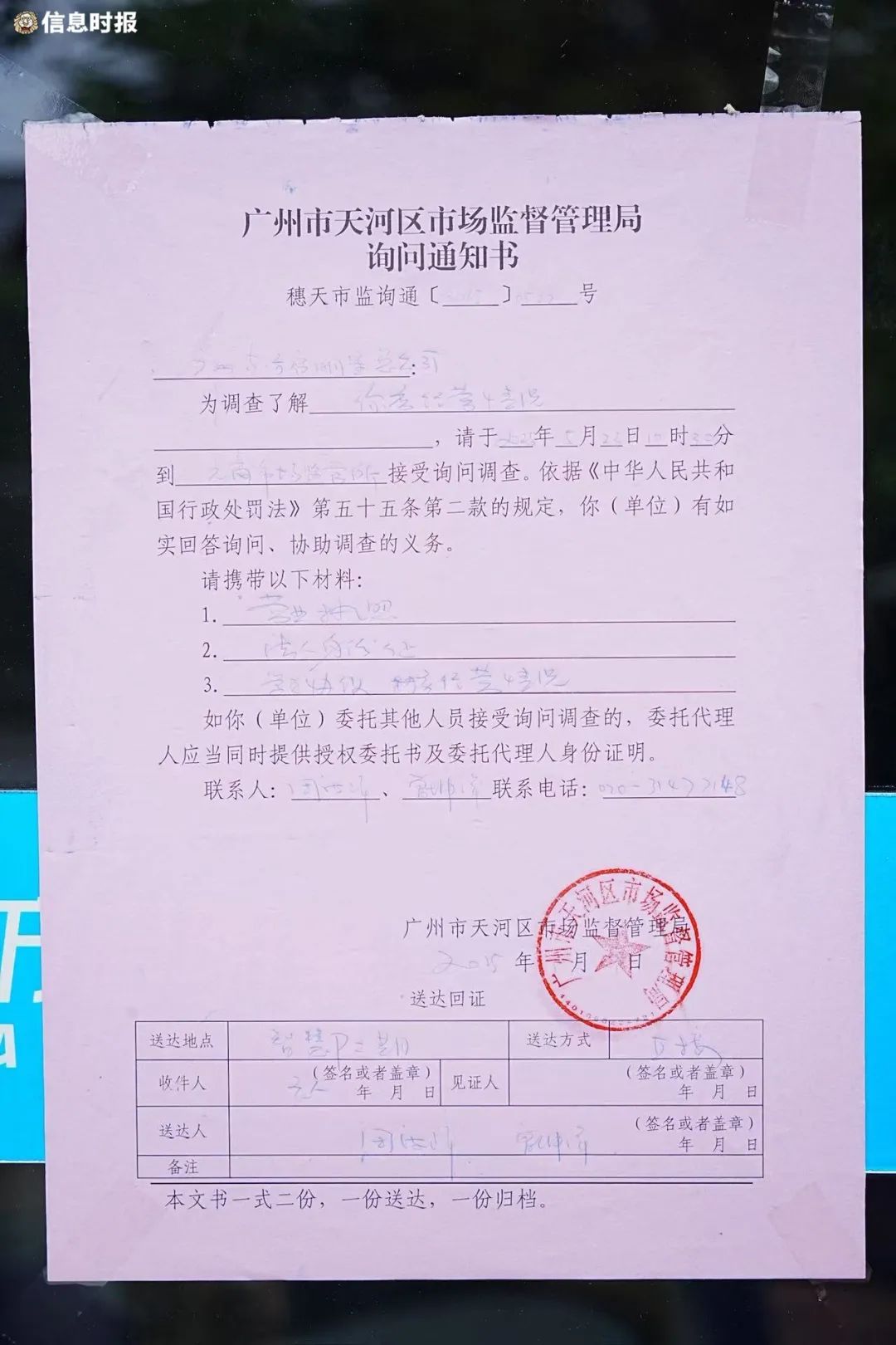 门口张贴着广州市天河区市场监督管理局询问通知书。园区工作人员表示,该培训机构相关负责人已经被约谈问询。