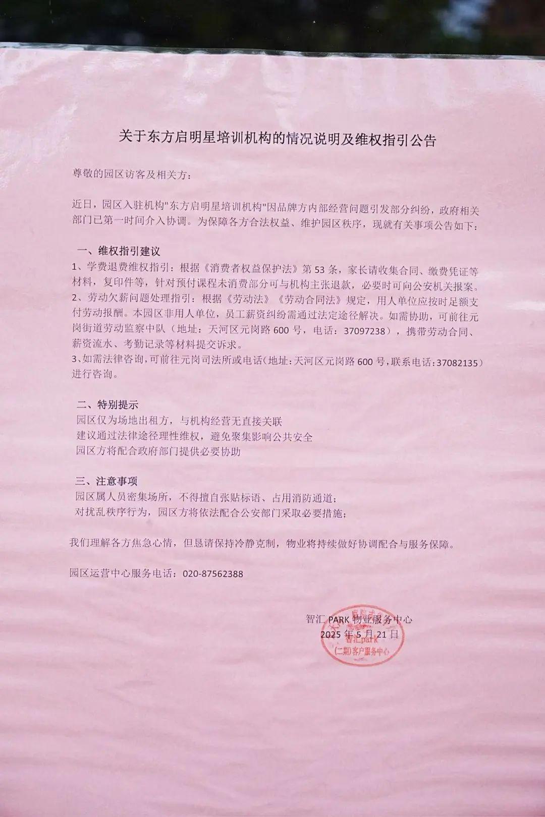 22日上午,记者来到位于天河区元岗·智汇PARK二期的“东方启明星”广州总部。刚进园区,就看到园区入口处张贴了“关于东方启明星培训机构的情况说明及维权指引公告”。公告表示,近日,园区入驻机构“东方启明星培洲机构”因品牌方内部经营问题引发部分纠纷,政府相关部门已第一时间介入协调。