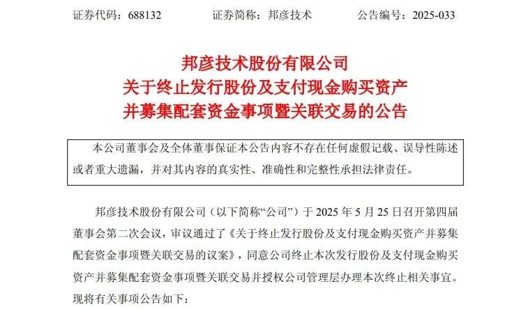 2025年5月25日晚间,邦彦技术(688132)一纸公告宣告了历时半年的重大资产重组计划终止。