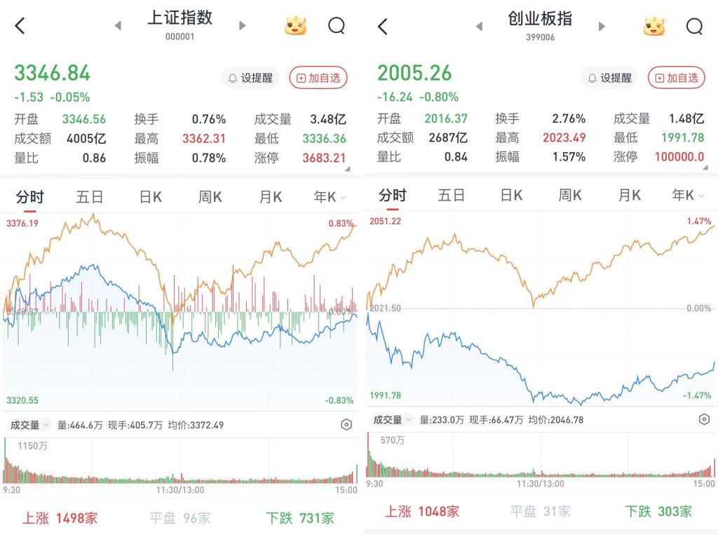至收盘,上证综指跌0.05%,报3346.84点;科创50指数涨0.17%,报982.26点;深证成指跌0.41%,报10091.16点;创业板指跌0.8%,报2005.26点。