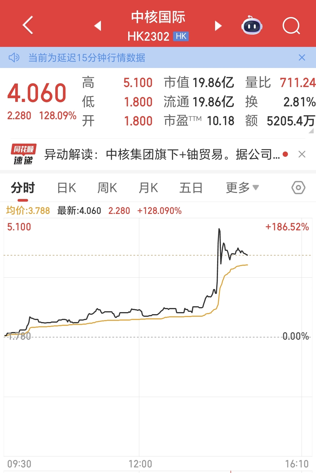 而在港股市场上,中核国际盘中一度大涨超180%,截至15:14,涨幅达128.09%。据同花顺财经报道,中核国际为作为中核集团旗下唯一海外铀资源运作平台。2024年财报显示,公司扩大铀贸易规模,全年销售约577万磅天然铀,总收入达18.41亿港元,同比大幅增长217%。全年净利润为1.95亿港元,同比增长83.4%。