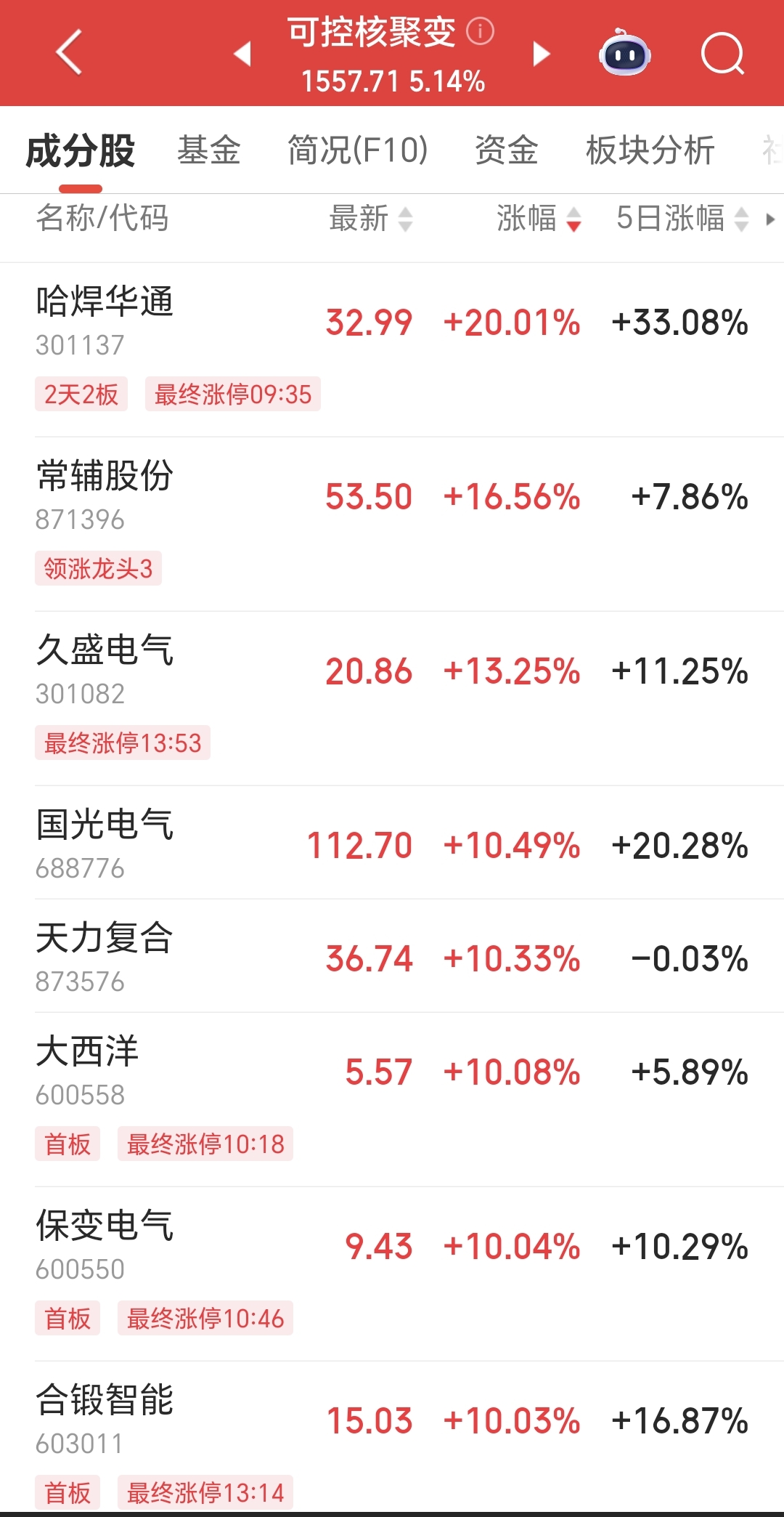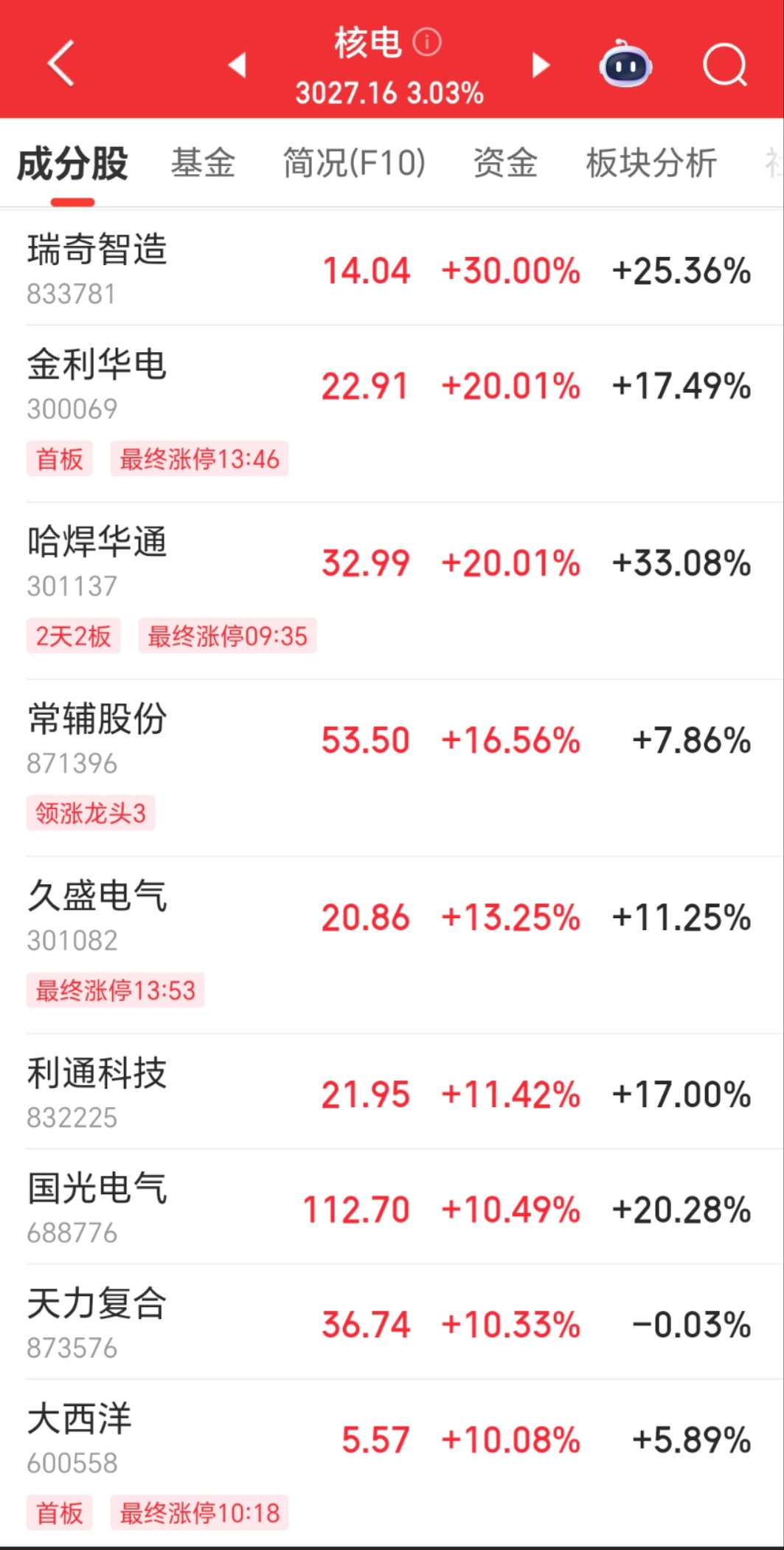 截至收盘,瑞奇智造30CM涨停,常辅股份涨24%,哈焊华通20CM涨停,久盛电气涨超16%,中洲特材涨超14%,天力复合涨超11%,大西洋、保变电气、长城电工、中核科技、尚纬股份、锡装股份、中广核技、融发核电、哈空调10CM涨停,广厦环能、兰石重装、南风股份等跟涨。