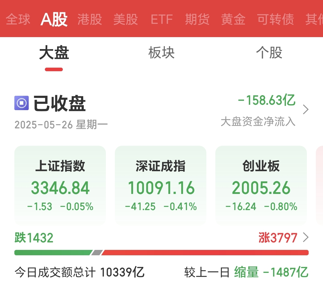 5月26日,A股市场全天震荡调整,创业板指领跌,宁德时代跌近5%。截至收盘,沪指跌0.05%,深成指跌0.41%,创业板指跌0.8%。沪深两市全天成交额1.01万亿,较上个交易日缩量1456亿。