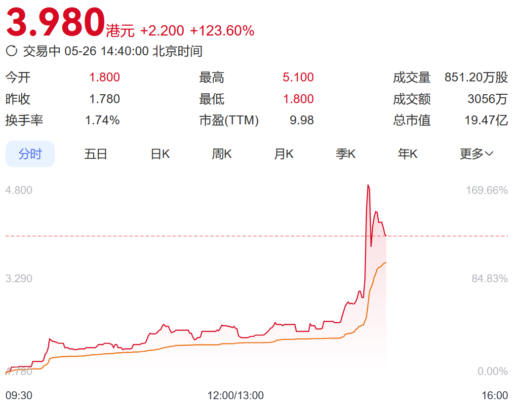 5月26日午后,港股中核国际持续拉升,涨幅一度扩大至180%,截至发稿涨幅回落至123.6%。公司自2003年1月6日起在香港联合交易所有限公司上市,为中核集团旗下唯一海外铀资源运作平台。