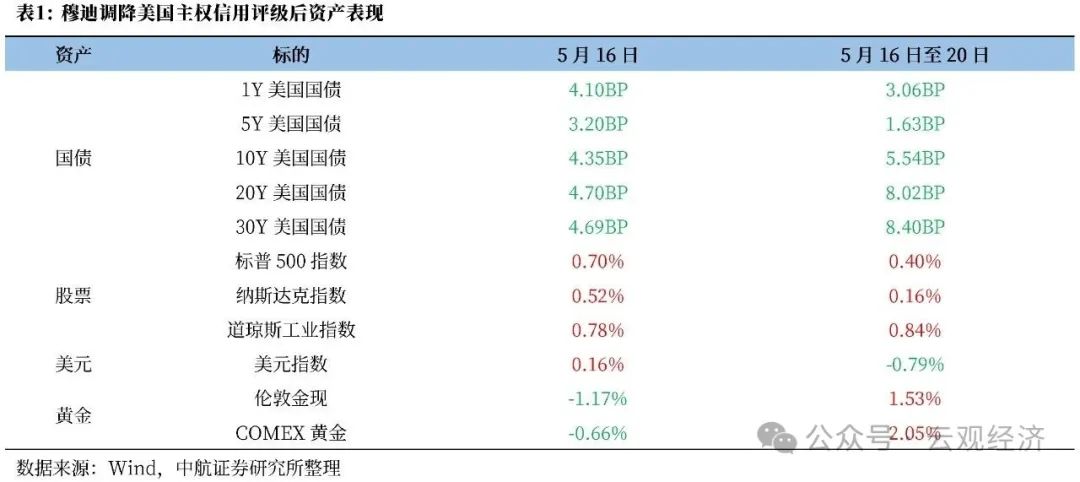 5月16日穆迪调降美国主权信用评级当天,投资者对于政府债务和利息支出负担的恐慌情绪立即在债市做出反应,短期、中期和长期美国国债收益率全面上行,但市场风险偏好并未受到较大影响,股指仍然全面收红,美元指数小幅收红,黄金收跌。5月19日穆迪下调主要银行的部分信用评级后,5月16日至20日累计涨跌幅来看,短期、中期、长期美债收益率仍然受到担忧情绪影响。美股三大指数收红,美元指数下降,黄金上行。