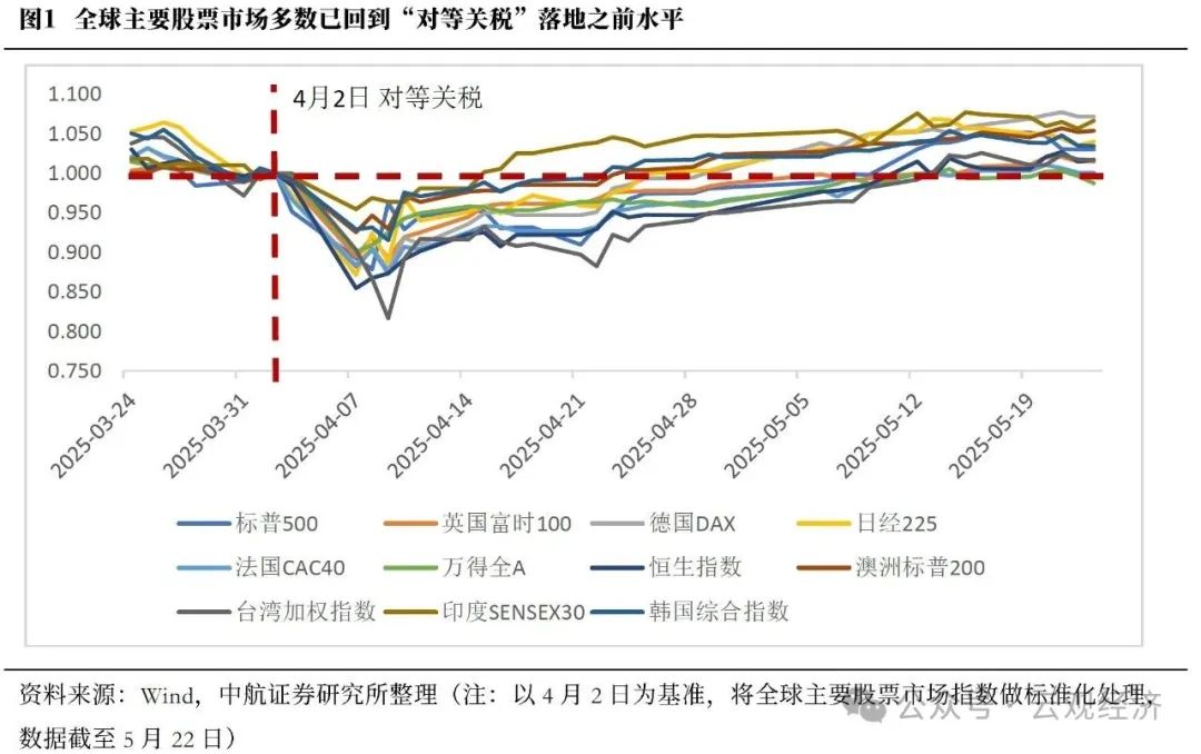 美国“对等关税”政策落地后,全球主要股票市场波动快速放大,先快速下跌,约一周后见底快速回升。5月以来全球主要股票市场波动逐渐下降,截至5月22日,多数主要市场已回到并超越4月2日的水平。这背后或是因为90天豁免期内全球内抢出口有望支撑短期经济,同时美国与多国谈判引发的关税缓和预期改善风险偏好。