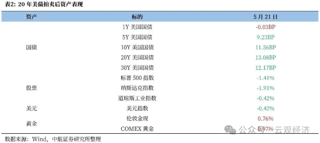 本次调降后,美国20年期国债拍卖遭遇需求低迷,恐慌情绪被放大后导致美国股债汇三杀,黄金等避险资产有望受益。当地时间5月21日,美国财政部发布的结果显示,20年美债最终得标利率为5.047%,较预发行利率5.035%上升约1.2个基点,创下去年12月以来的最大尾部利差。较上个月的4.810%上升约24个基点,并且是历史第二次得标利率超过5%。资本市场反应迅速,当日债市仅短期国债收红,中期及长期国债收益率大幅上行,20年美国国债收益率一度飙升至5.127%,录得2023年12月4日以来的最高水平,美国30年国债收益率最高飙升至5.099%。恐慌情绪蔓延至债市之外,三大股指全面收跌,美元指数跌破100点位,黄金上行。