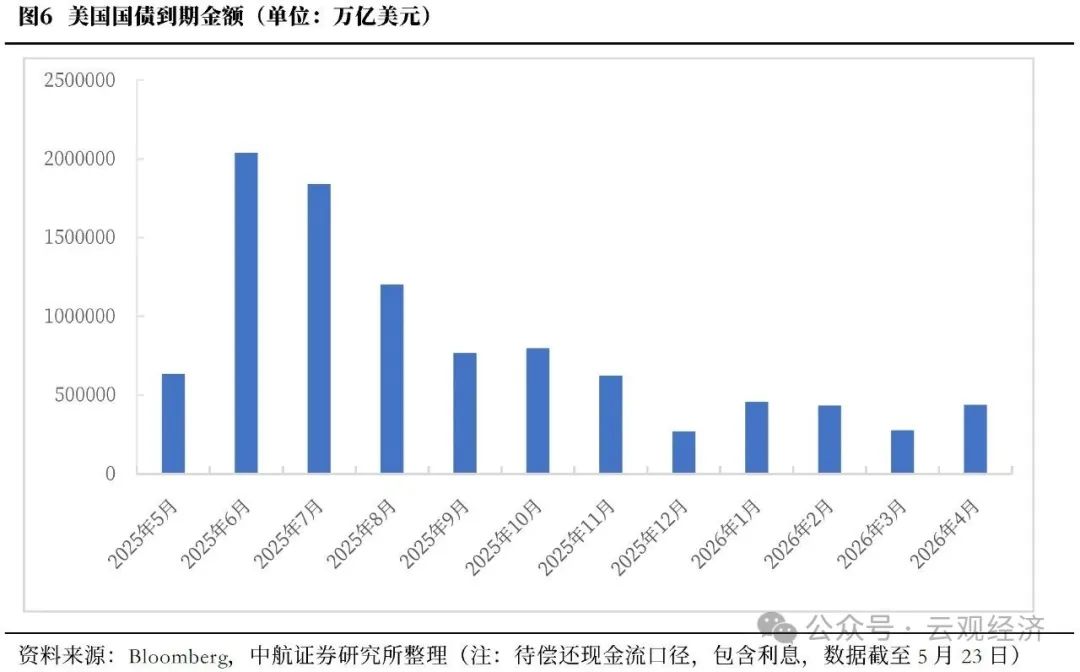 中长期看,美国债务水平持续增长下,美债海外需求是其不确定性来源。此前美国国会预算办公室预测美国公众持有的联邦政府债务与GDP之比将在2029年创下107%的历史新高,到2055年联邦政府赤字率将达到GDP的7.3%,这或加剧海外投资者对美国债务可持续性的担忧。当地时间5月16日,美国财政部公布的数据显示,2025年3月,美债前三大海外债主中,日本、英国增持美国国债,但中国减持,减持后中国由美国第二大债主变为第三大债主。短期看,6-7月美国国债到期金额高企,偿还压力或迫使美国以借新还旧的手段缓解政府债务压力。但当前仍需关注两党债限谈判情况,美债长端利率仍有上行风险。