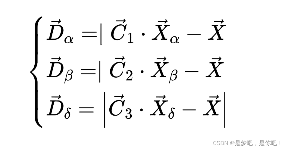 式中,Da,Dβ和D6分别表示a,β和5与其他个体间的距离;Xa,Xβ和X6分别代表a,β和5的当前位置;C1,C2,C3是随机向量,X是当前灰狼的位置。