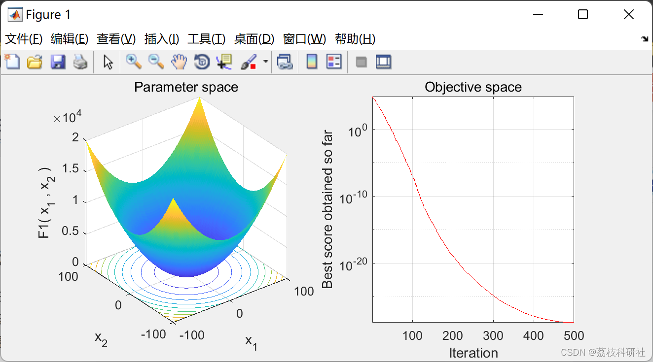 while l for i=1:size(Positions,1) % Return back the search agents that go beyond the boundaries of the search space Flag4ub=Positions(i,:)>ub; Flag4lb=Positions(i,:) Positions(i,:)=(Positions(i,:).*(~(Flag4ub+Flag4lb)))+ub.*Flag4ub+lb.*Flag4lb; % Calculate objective function for each search agent fitness=fobj(Positions(i,:)); % Update Alpha, Beta, and Delta if fitness Alpha_score=fitness; % Update alpha Alpha_pos=Positions(i,:); end if fitness>Alpha_score && fitness Beta_score=fitness; % Update beta Beta_pos=Positions(i,:); end if fitness>Alpha_score && fitness>Beta_score && fitness Delta_score=fitness; % Update delta Delta_pos=Positions(i,:); end end a=2-l*((2)/Max_iter); % a decreases linearly fron 2 to 0 % Update the Position of search agents including omegas for i=1:size(Positions,1) for j=1:size(Positions,2) r1=rand(); % r1 is a random number in [0,1] r2=rand(); % r2 is a random number in [0,1] A1=2*a*r1-a; % Equation (3.3) C1=2*r2; % Equation (3.4) D_alpha=abs(C1*Alpha_pos(j)-Positions(i,j)); % Equation (3.5)-part 1 X1=Alpha_pos(j)-A1*D_alpha; % Equation (3.6)-part 1 r1=rand(); r2=rand(); A2=2*a*r1-a; % Equation (3.3) C2=2*r2; % Equation (3.4) D_beta=abs(C2*Beta_pos(j)-Positions(i,j)); % Equation (3.5)-part 2 X2=Beta_pos(j)-A2*D_beta; % Equation (3.6)-part 2 r1=rand(); r2=rand(); A3=2*a*r1-a; % Equation (3.3) C3=2*r2; % Equation (3.4) D_delta=abs(C3*Delta_pos(j)-Positions(i,j)); % Equation (3.5)-part 3 X3=Delta_pos(j)-A3*D_delta; % Equation (3.5)-part 3 Positions(i,j)=(X1+X2+X3)/3;% Equation (3.7) end end l=l+1; Convergence_curve(l)=Alpha_score; end [1]晏福,徐建中,李奉书.混沌灰狼优化算法训练多层感知器[J].电子与信息学报,2019,41(04):872-879.