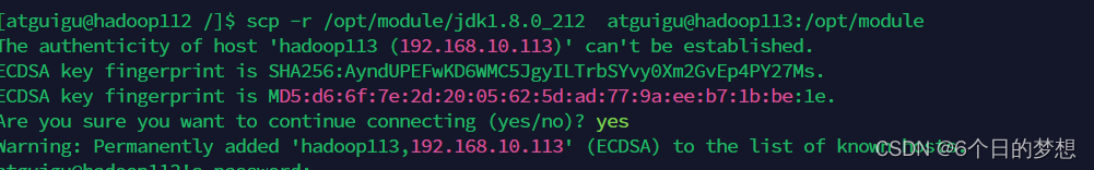 [atguigu@hadoop112 ~]$ scp -r /opt/module/jdk1.8.0_212 atguigu@hadoop113:/opt/module