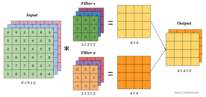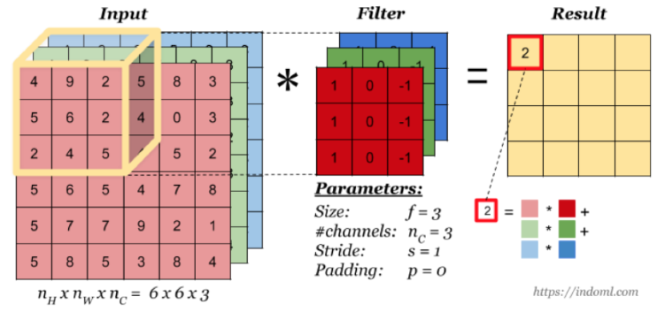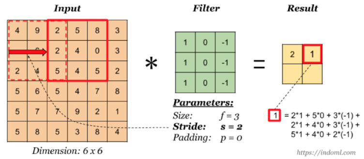 相当于将 Filter 放在Image 上,从左到右、从上到下地(默认一个像素)移动过整个Image,分别计算 ImageImage 被 Filter 盖住的部分与 Filter的逐元素乘积的和