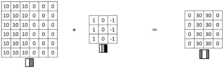 在这个6×6 的图像中,左边一半像素的值全是 10,右边一半像素的值全是 0,中间是一条非常明显的垂直边缘。这个图像与过滤器卷积的结果中,中间两列的值都是 30,两边两列的值都是 0,即检测到了原 6×66×6 图像中的垂直边缘。