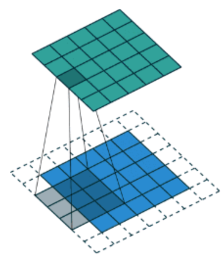 这张图中,还是移动一个像素,并且外面增加了一层0。那么最终计算结果我们可以这样用公式来计算:, P为1,那么最终特征结果为5。实际上我们可以填充更多的像素,假设为2层,则