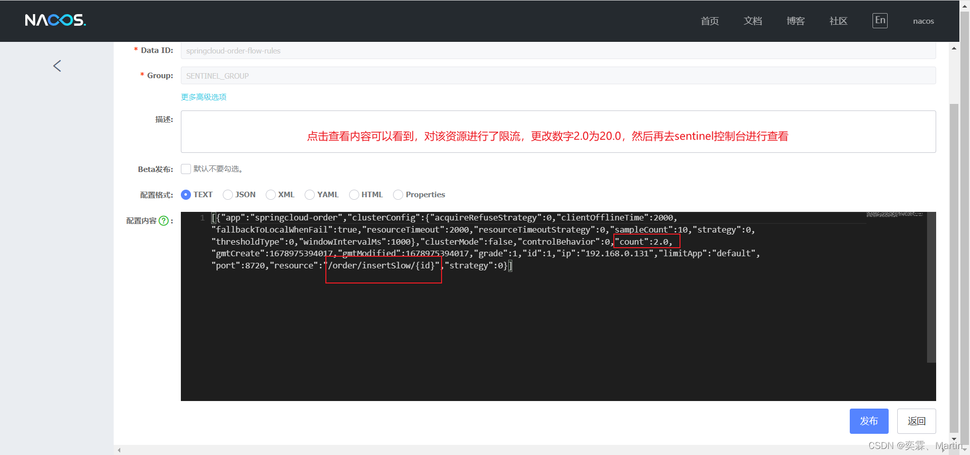 可以在 sentinel 控制台中编辑 限流配置,并且同步到 nacos 做持久化