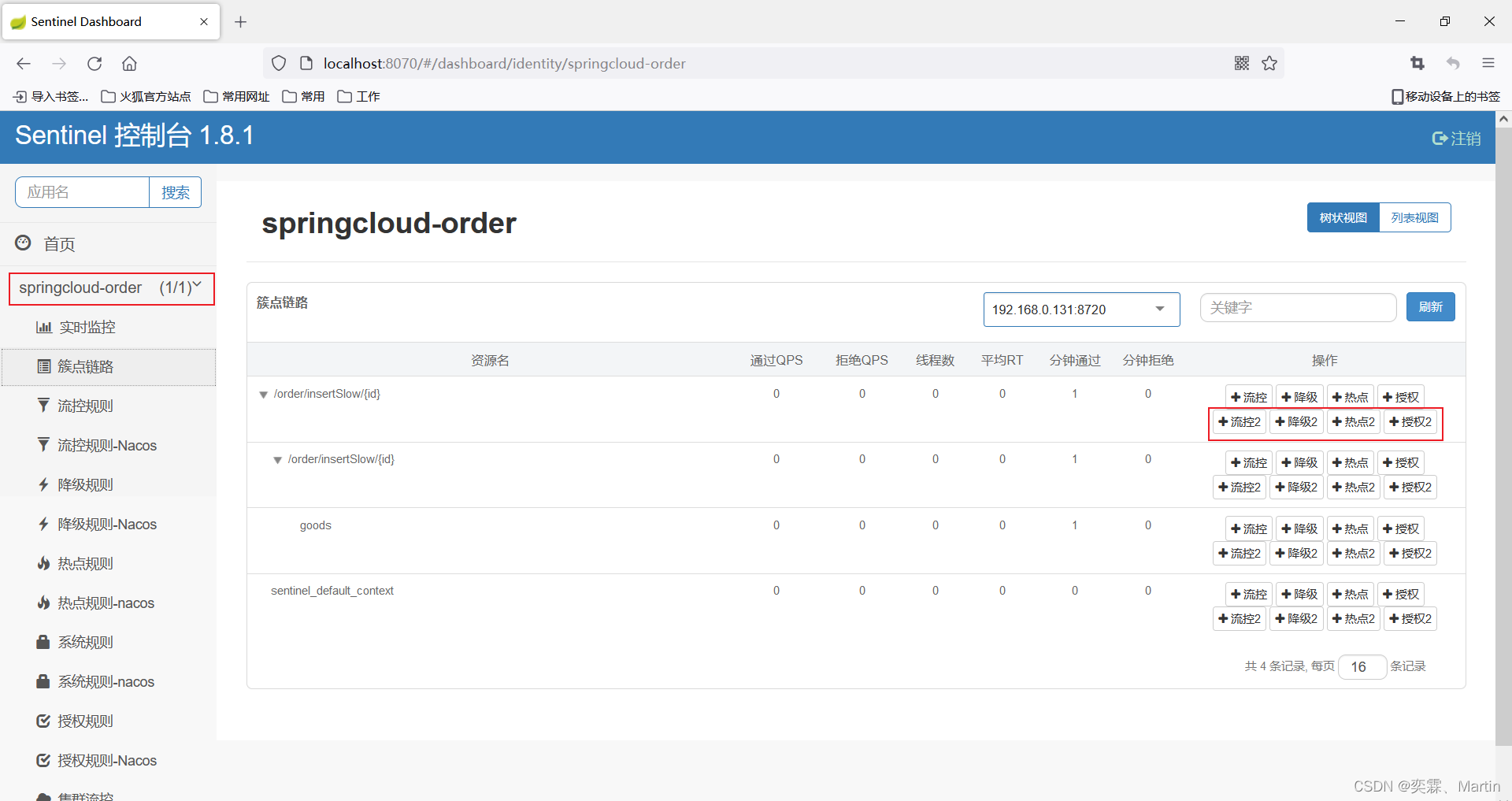 增加流控规则:一定要点 带 2 的,只有带 2 的才能推送到 nacos,在 流控规则 选项中添加也不行,只能点击 蓝色方框才能推送到 nacos