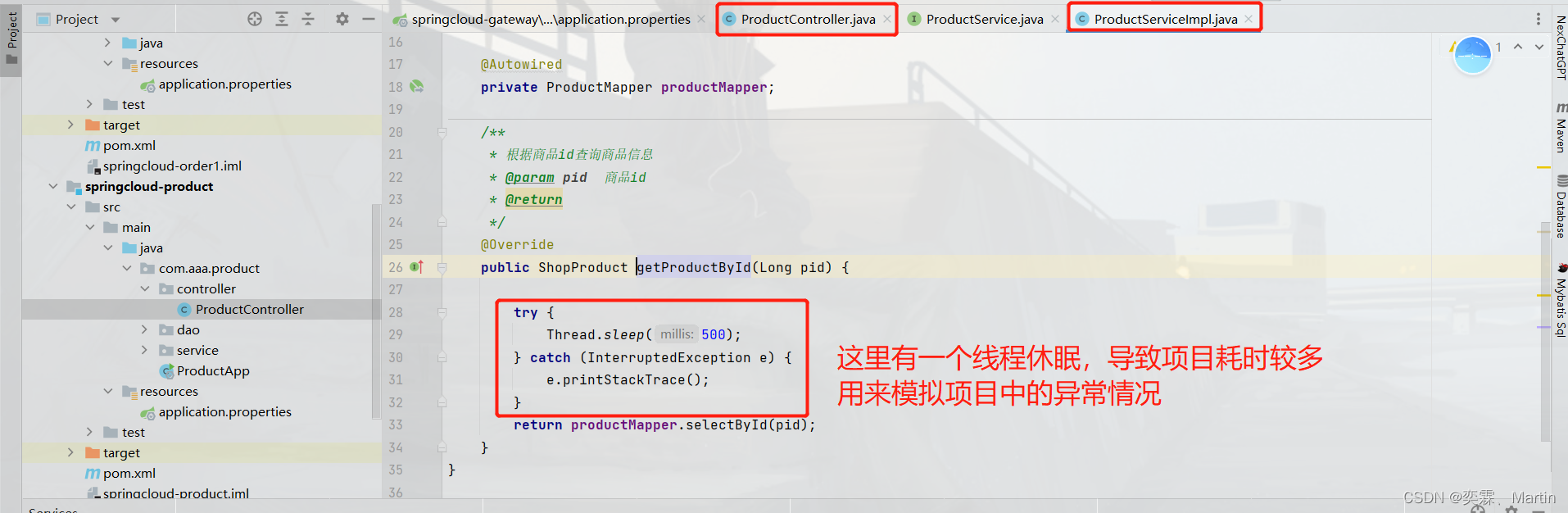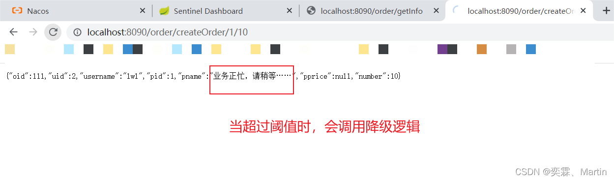 @GetMapping("insertSlow/{id}")public String insertSlow(@PathVariable Integer id){if (id==1){ //id=1时,线程休眠try {Thread.sleep(100);} catch (InterruptedException e) {e.printStackTrace();}}else if (id==2){ //id=2时,线程抛出异常throw new RuntimeException("异常");}orderService.queryGoods();//除此之外的订单都是正常业务return "添加订单";}