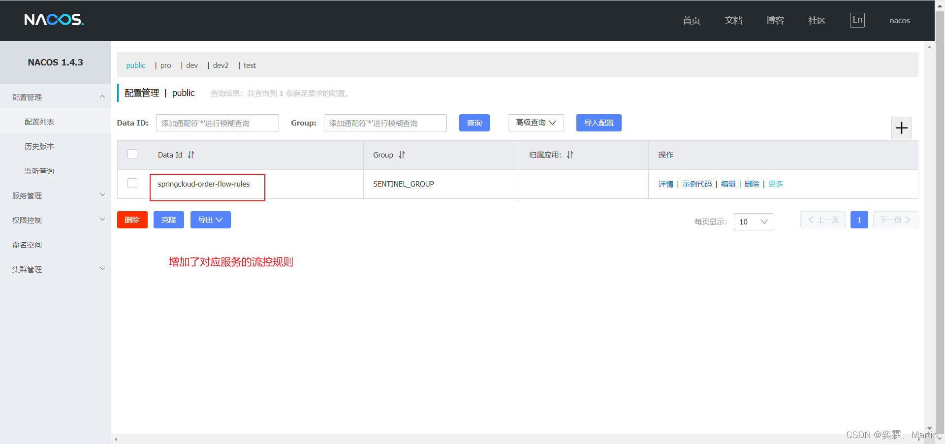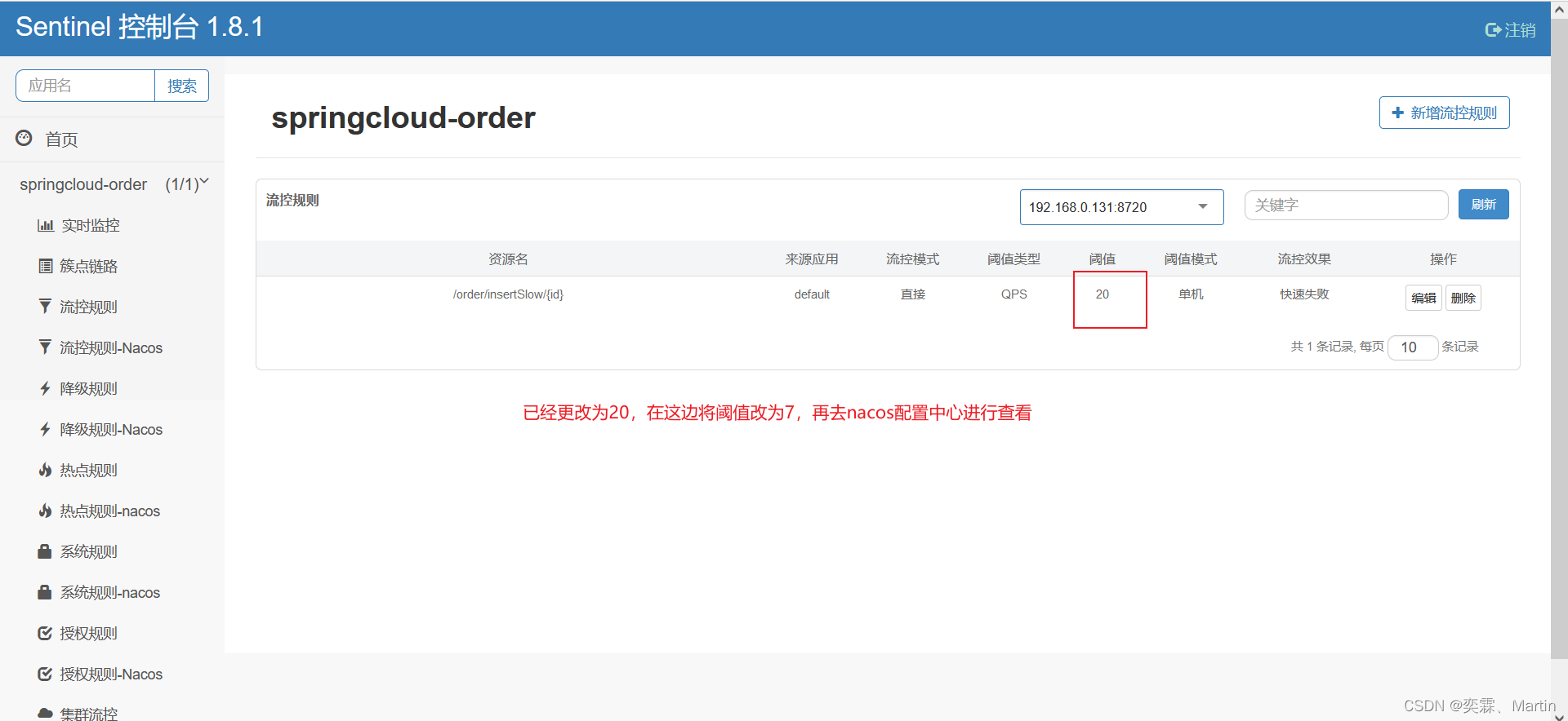 在 nacos 中修改了限流配置,也可以同步到 sentinel 控制台