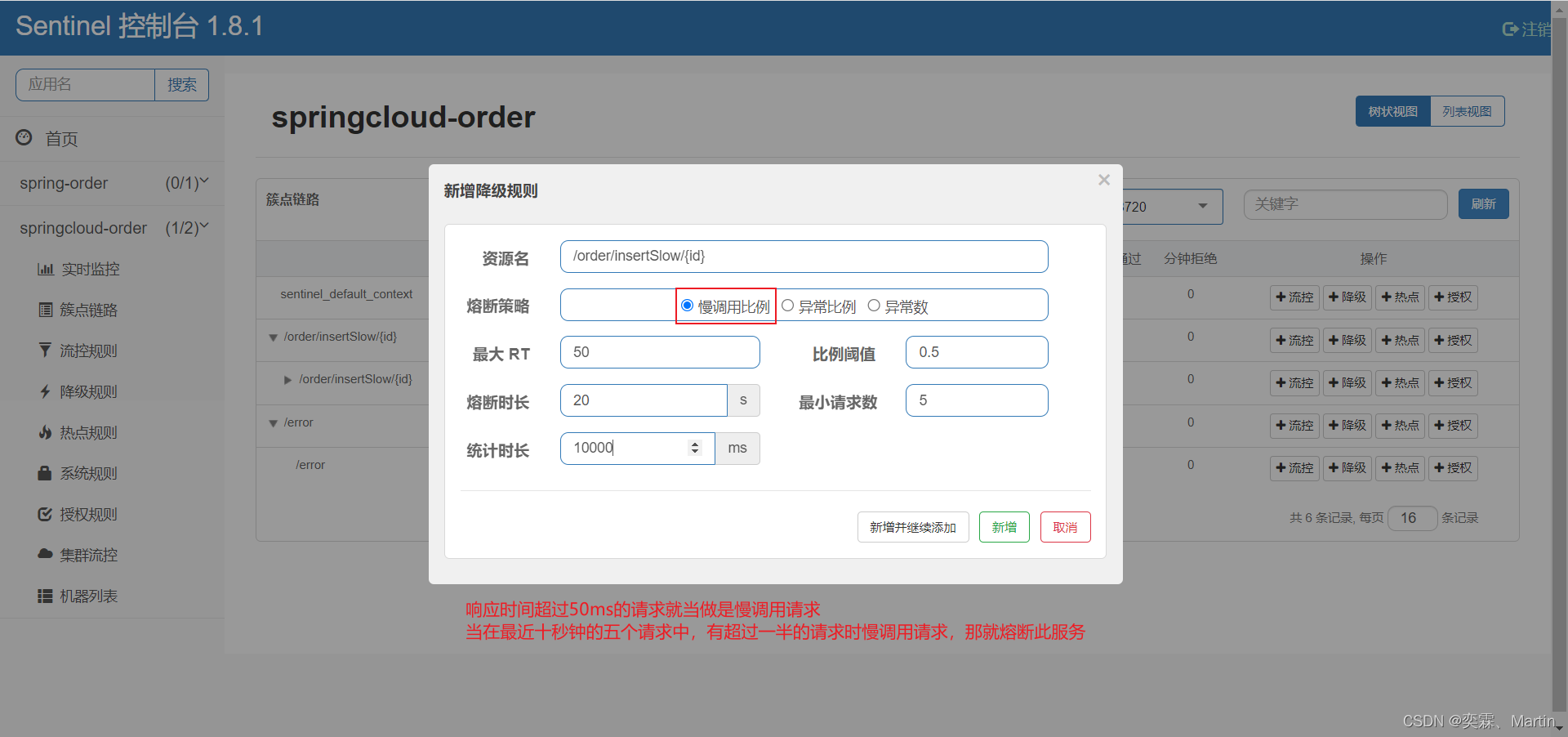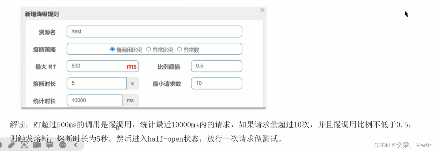慢调用:业务的响应时长 (RT) 大于指定时长的请求认定为慢调用请求。在指定时间内,如果请求数量超过设定的最小数量,慢调用比例大于设定的闯值,则触发熔断。例如:
