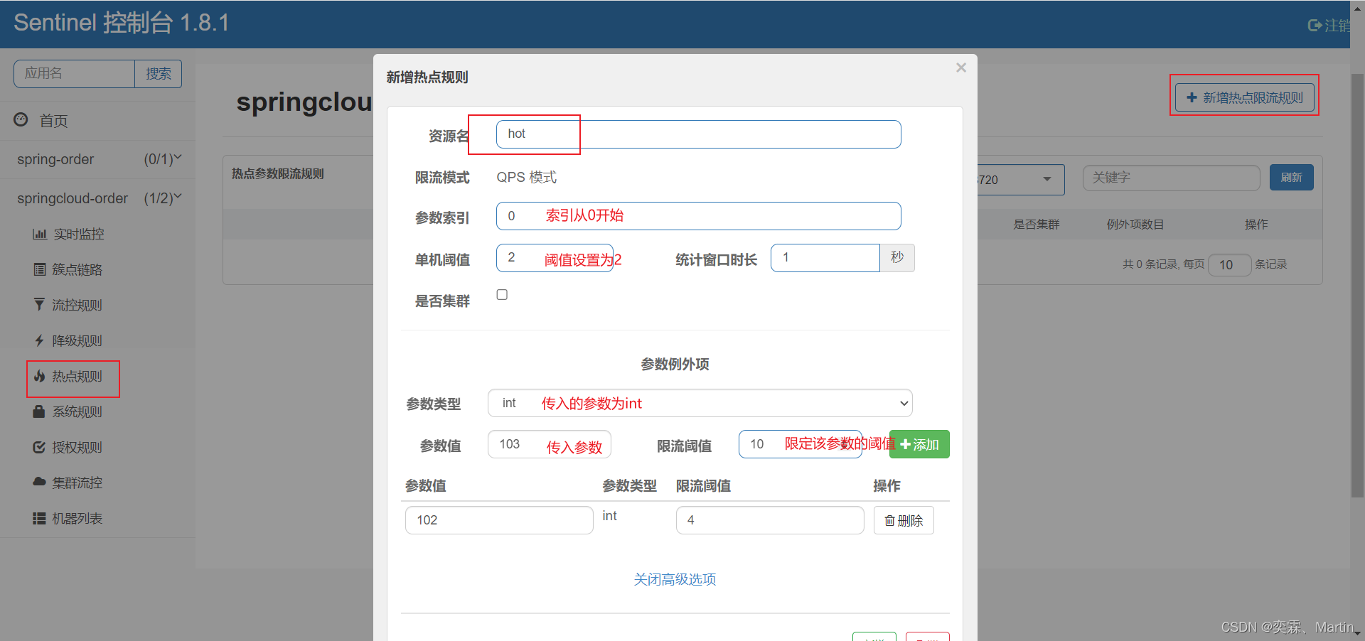 给/order/{hot}这个资源添加热点参数限流,规则如下: