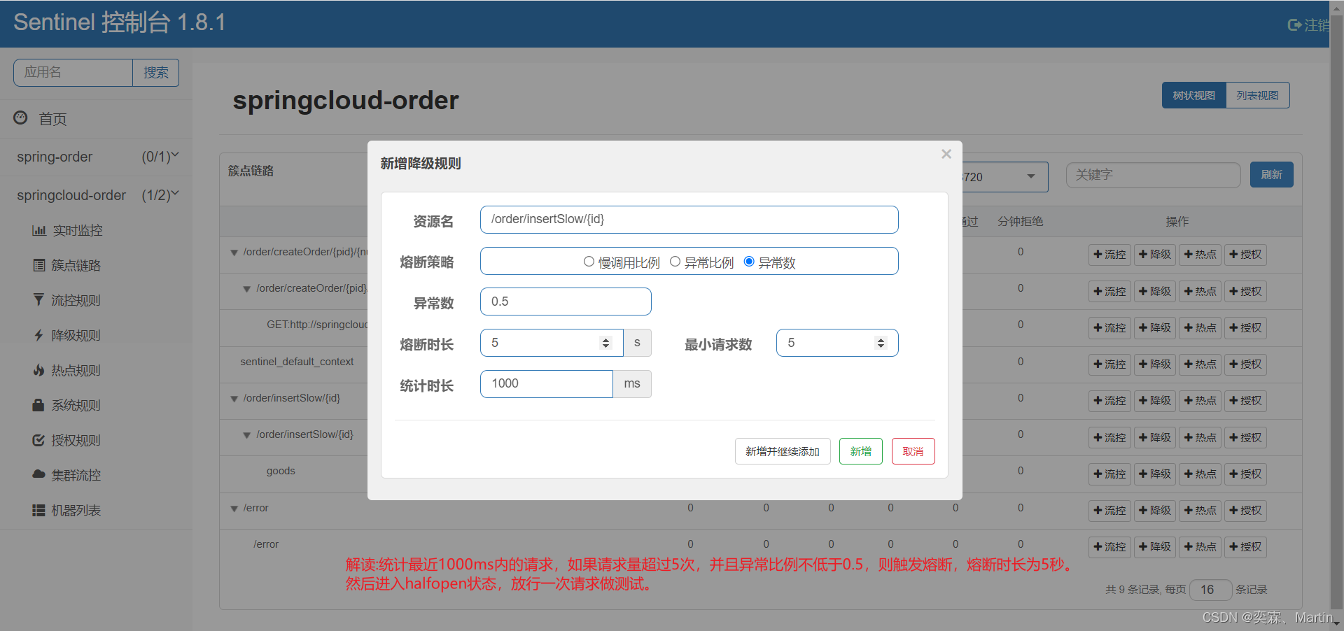 异常比例或异常数:统计指定时间内的调用,如果调用次数超过指定请求数,并且出现异常的比例达到设定的比例闯值(或超过指定异常数),则触发熔断。例如: