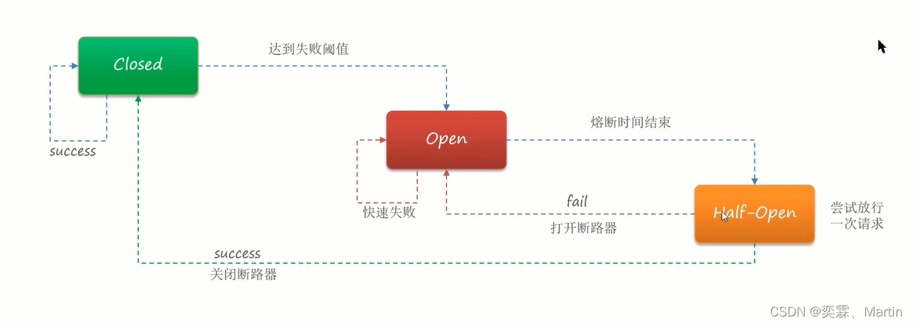 熔断降级是解决雪崩问题的重要手段。其思路是由断路器统计服务调用的异常比例、慢请求比例,如果超出闽值则会熔断该服务。即拦截访问该服务的一切请求;而当服务恢复时,断路器会放行访问该服务的请求。