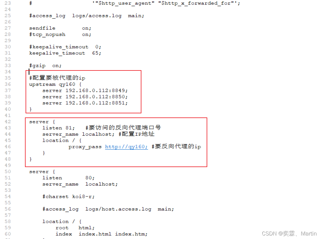 server {listen 81; #要访问的反向代理端口号server_name localhost; #配置IP地址location / {proxy_pass http://qy160; #要反向代理的ip}}