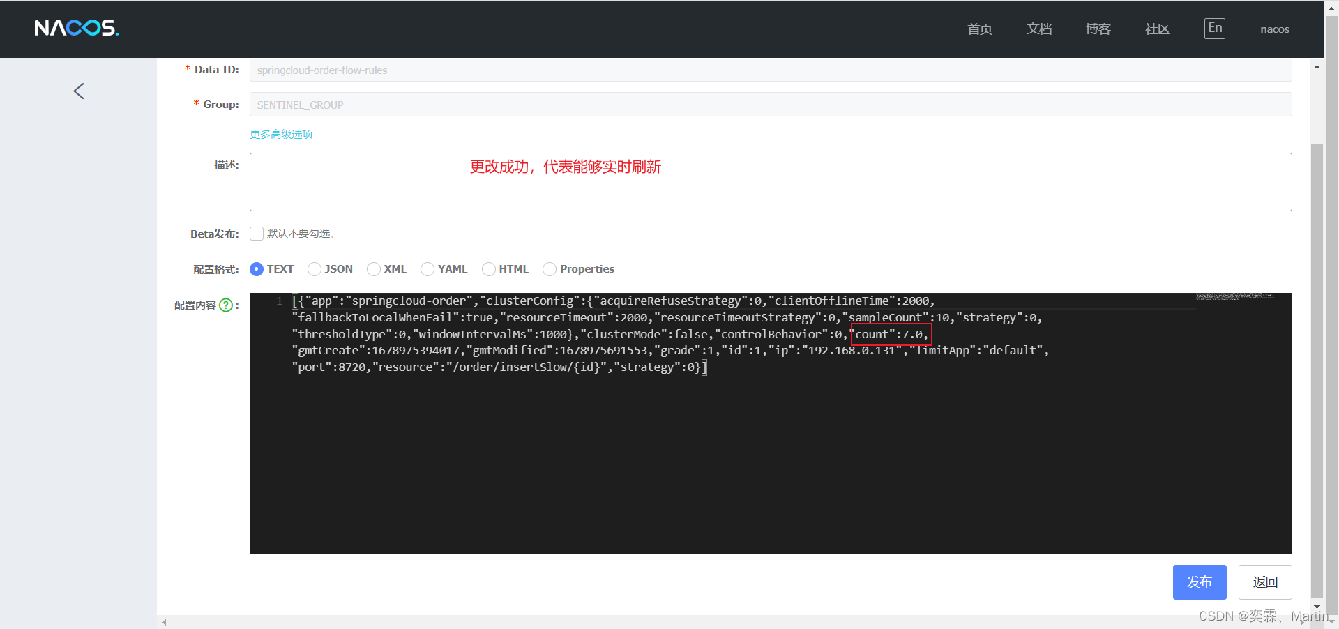 再次更改后,观察nacos配置中心