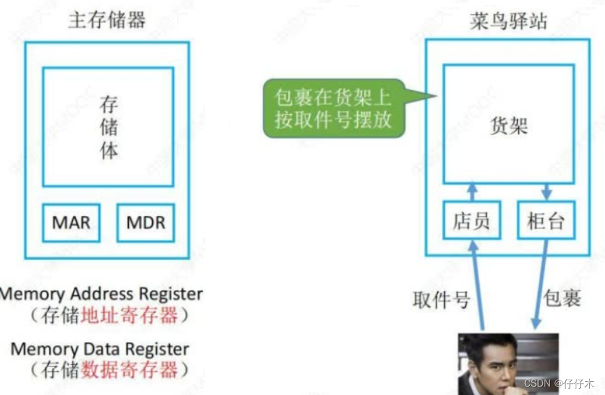- 上图解析:我将取件号(访存地址)给店员(MAR),店员就可以根据取件号(访存地址)去货架(存储体)上找到我想要的包裹(存储器中的信息),然后将包裹(存储器中的信息)放到柜台(MDR),我就可以取走包裹(存储器中的信息)啦