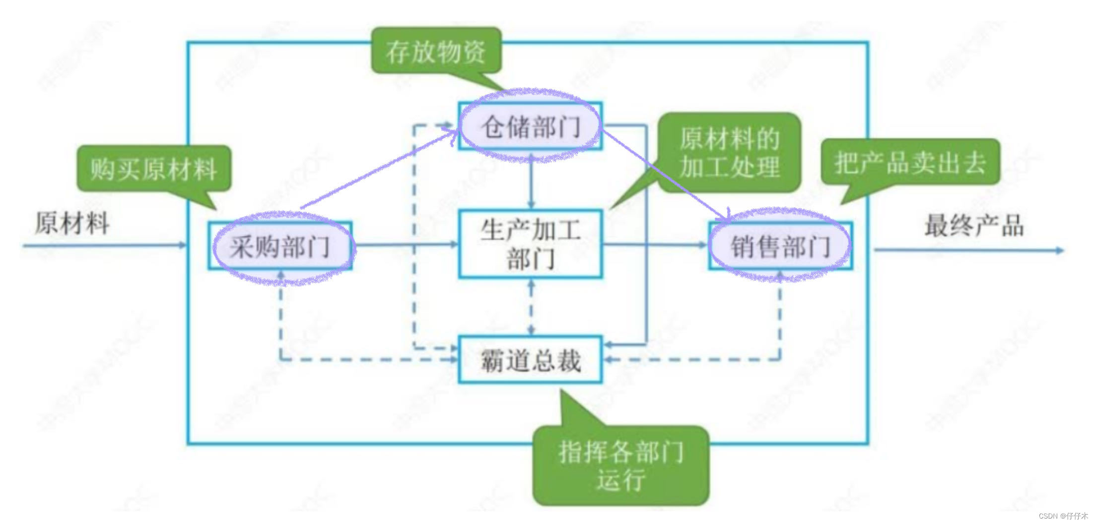 由图可知:采购部门(输入设备)不可以直接将原材料给仓储部门(存储器),仓储部门(存储器)也不可直接将处理后的原材料给销售部门(输出设备),冯诺依曼只能通过生产加工部门(运算器)来传递原材料,效率大大的降低了