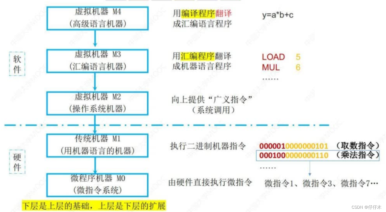 3~5层称为虚拟机,简单来说就是软件实现的机器(汇编和高级语言并不能被硬件直接理解和执行),虚拟机器只对该层的观察者存在。