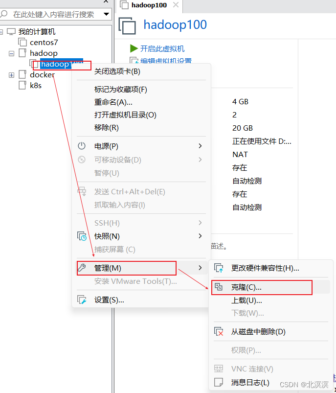 ①点击hadoop100虚拟机,右键,选择管理->克隆,进入克隆页面