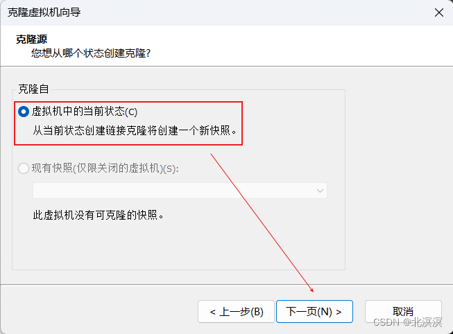 ②点击下一步,选择克隆自虚拟机的当前状态,点击下一步