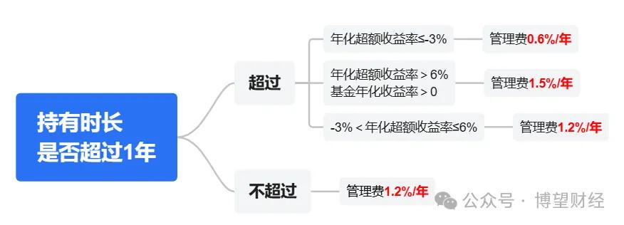 我们以正在发行的南方瑞享混合为例,如果您持有该基金份额一年后赎回,若期间年化超额收益率跑输业绩比较基准3个百分点及以上,管理费则按0.6%/年收取;若跑赢业绩比较基准6个百分点及以上且基金年化收益为正,则适用1.5%/年;其他情形则适用1.2%/年。