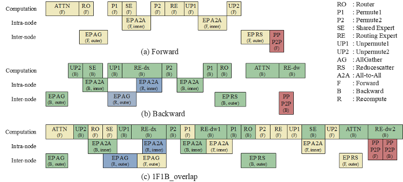 图1 :自适应细粒度前反向掩盖方案:(a) warmup阶段纯前向;(b) cooldown阶段纯反向;(c) stable阶段前反向掩盖;第一行为计算算子,第二行为机内EP通信,第三行为机间EP通信;F代表前向算子,B代表反向算子,R代表重计算算子,PP P2P代表stage间的P2P通信。