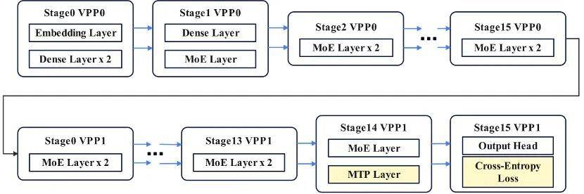 虚拟流水线层间负载均衡(P)。MoE模型通常采用混合结构,Dense层、MTP层、输出层所在的Stage与纯MoE层所在的Stage负载不均,会造成的Stage间等待。团队提出虚拟流水线层间负载均衡技术,将MTP层与输出层分离,同时将MTP Layer的 Embedding计算前移至首个Stage,有效规避Stage间等待问题,实现负载均衡。