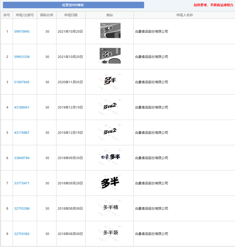 6月5日,红星资本局查询中国商标网发现,除了申请多个含“多半”的相关商标,白象还曾申请“多半桶”和“多半袋”两个商标,上述两个商标均未注册成功。