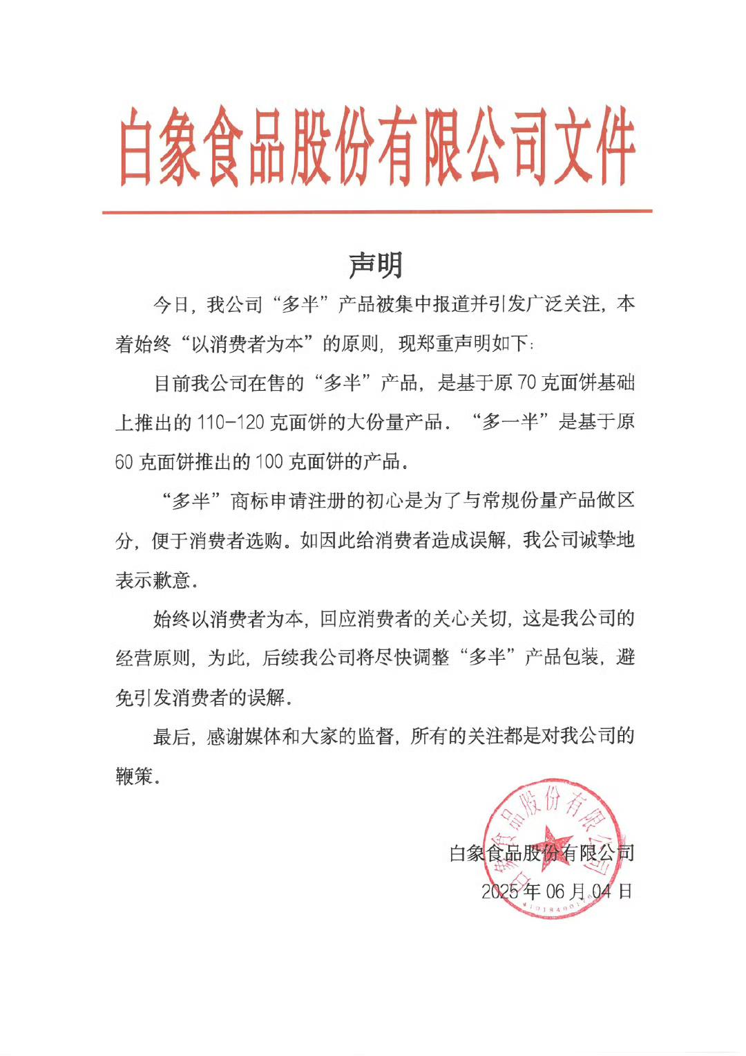 6月4日,白象食品在其官方微博发布声明致歉,并称目前公司在售的“多半”产品,是基于原70克面饼基础上推出的110-120克面饼的大份量产品。“多一半”是基于原60克面饼推出的100克面饼的产品。“多半”商标申请注册的初心是为了与常规份量产品做区分,便于消费者选购。后续公司将尽快调整“多半”产品包装,避免引发消费者的误解。