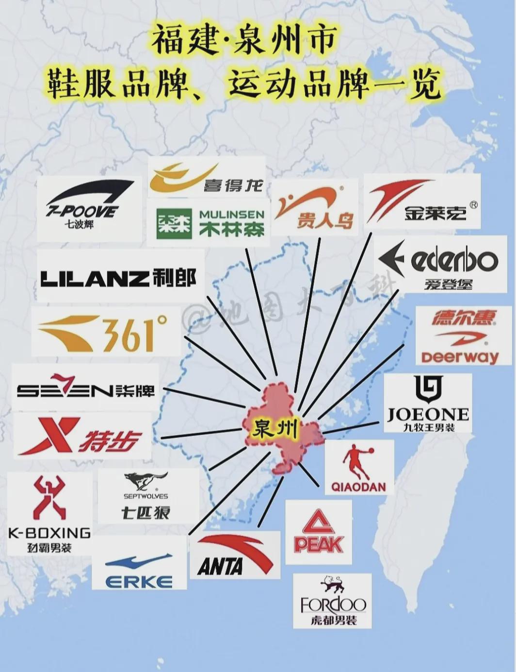 我们熟悉的安踏、特步、乔丹、361°、鸿星尔克、匹克、德尔惠全都是晋江品牌。