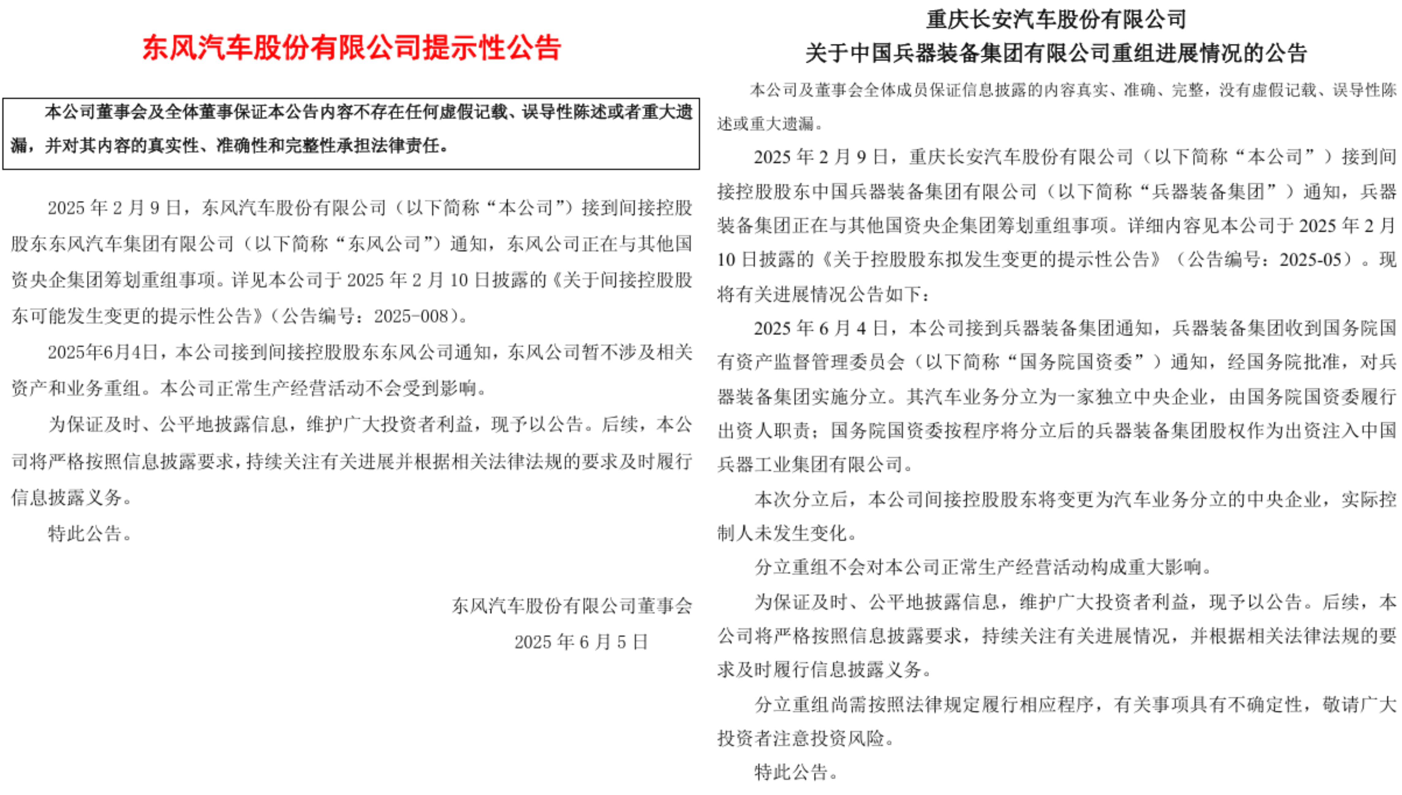 6月5日,东风系和兵装系密集发布重组进展公告。重庆长安汽车股份有限公司(简称“长安汽车”)公告称,经国务院批准,中国兵器装备集团有限公司(简称“兵器装备集团”)汽车业务将分立为一家独立中央企业。长安汽车间接控股股东将变更为汽车业务分立的中央企业,实际控制人未发生变化。