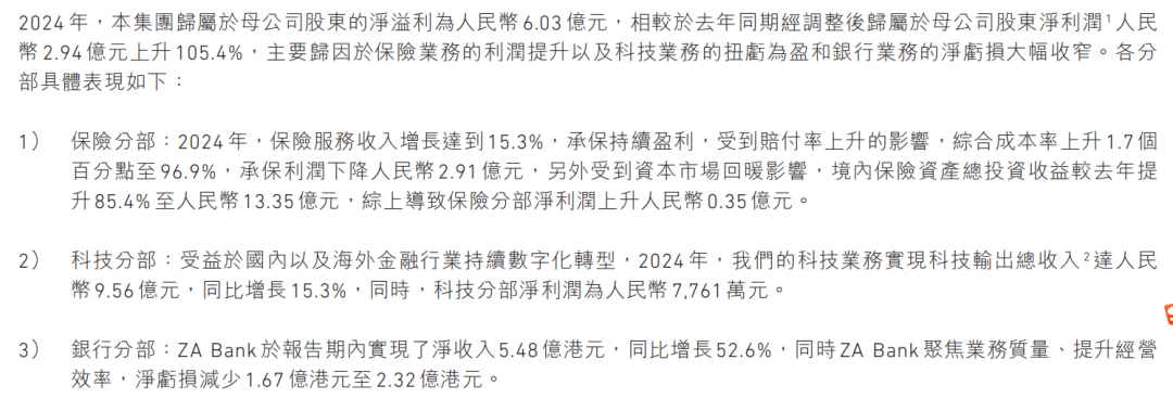2024年,众安在线全年实现总保费334.17亿元,同比增长13.3%,在国内财险行业的市场份额排名上升至第八位。归属于母公司股东的净溢利达到6.03亿元,相较于2023年同期经调整后的2.94亿元,大幅上升105.4%。这一增长主要得益于保险业务利润的提升、科技业务扭亏为盈,以及银行业务净亏损的大幅收窄。
