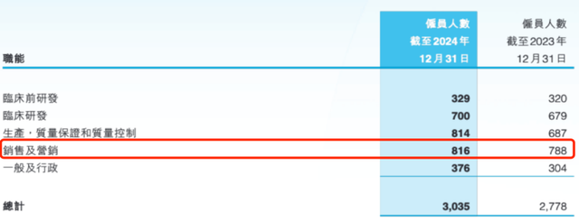 失去“输血式”授权收入的同时,康方生物重心转向自主商业化。为驱动产品销售,康方生物正在不断加强商业化团队的建设,销售团队从2023年的788人激增至2024年底的816人。但与之形成鲜明对比的是投入产出效率的恶化——同期康方生物销售成本也在翻倍增长,2024年销售成本同比增长了116.92%,达到2.89亿元。而公司商业销售的毛利仅微增16.53%至17.13亿元,成本增速是毛利增速的7倍有余。